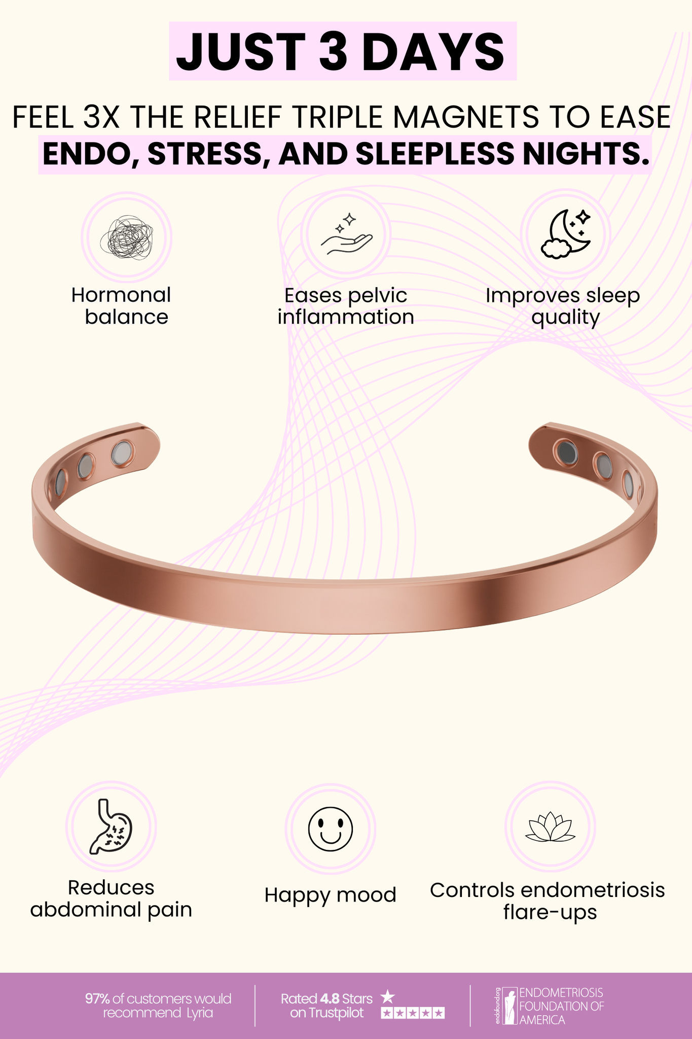 With the Lyria bracelet, you embrace a natural and elegant way to support your well-being. Powered by three precision magnets, it works in harmony with your body’s own magnetic field to help ease endo pain, calm stress, and restore balance — all while looking effortlessly refined on your wrist.