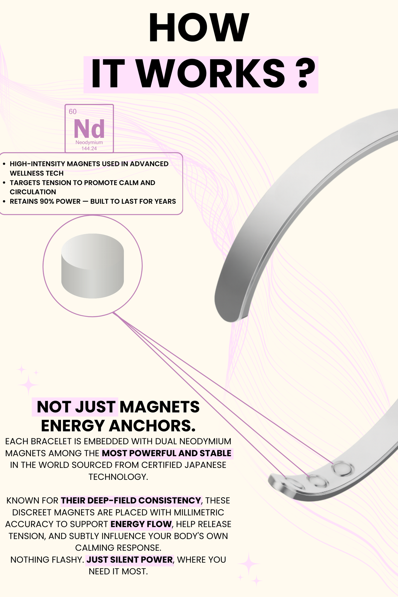 It combines a refined, adjustable design with discreet neodymium magnets chosen for their stability and subtle energetic influence. It’s not a medical device or a cure. It’s a wearable ritual that many describe as calming, grounding, and emotionally supportive. -